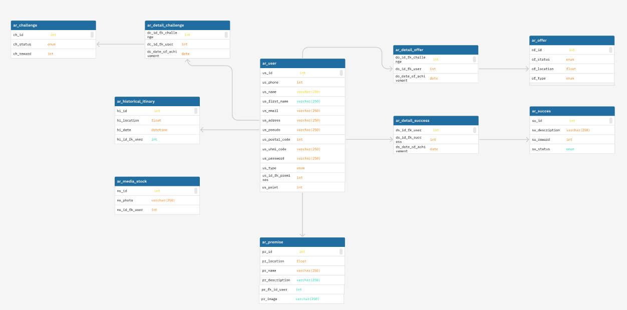A la suite de cela le développement de l’application a pu commencer. J’ai, dans un premier temps, mis en place la maquette de la base de données afin que nous puissions nous y retrouver pour développer différentes fonctionnalités. Dans cette maquette j'ai défini les différentes tables nécessaires ainsi que les liaisons entre les tables en me servant de propriétés définies en coordination avec l'équipe. Ci-dessous une image représentant notre base de données.