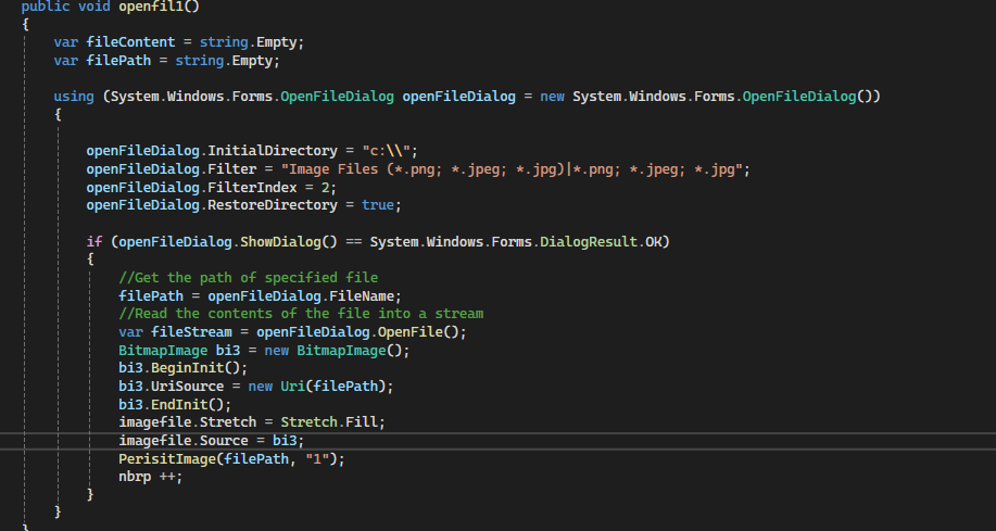 J’ai ensuite travaillé sur la réalisation du système d’images pour qu’elles soient gérées via la base de données et ainsi être présentes sur plusieurs postes de travail, pour cela j'ai dû gérer le fait qu'un local puisse avoir entre 0 et 3 images. Ensuite dans cette partie, j'ai modifié la base de données pour pouvoir y stocker des images et inséré des boutons pour ouvrir un explorateur de fichier permettant à l'utilisateur de choisir son image. Evidemment j'ai aussi mis en place une vérification du format du fichier pour éviter des erreurs de la part des utilisateurs pouvant mener à un crash de l'application. Ci-dessous une des méthodes utilisée pour gérer ces images.