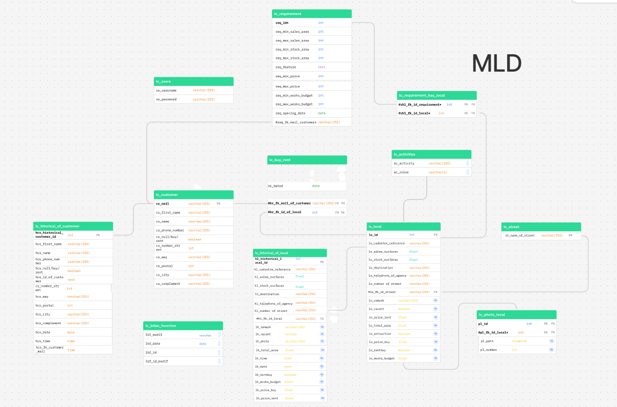 À la suite de cela j’ai commencé par travailler sur la base de données de l’application en mettant en place une architecture permettant aux différentes fonctionnalités d’être efficaces, en spécifiant des tables pour chacune des fonctionnalités nécessaires pour l'application mais également les propriétés de ces tables. Ci-dessous une image représentant l'architecture de notre base de données.